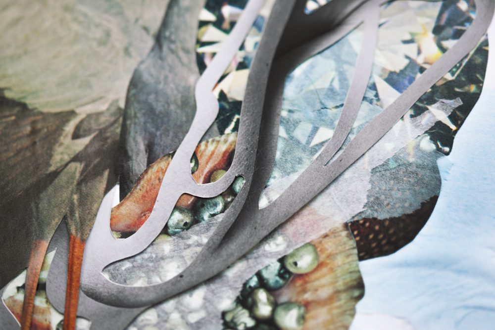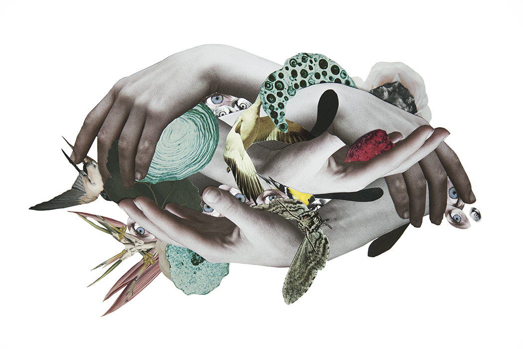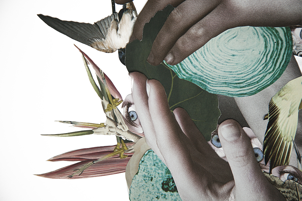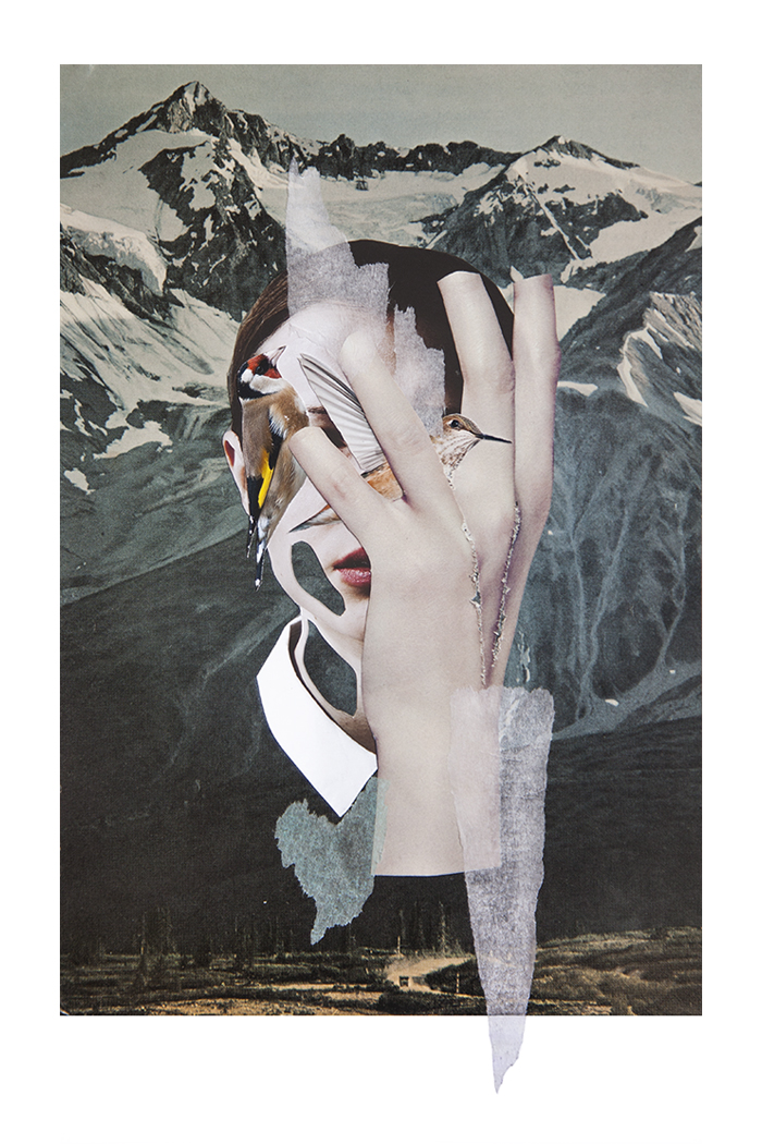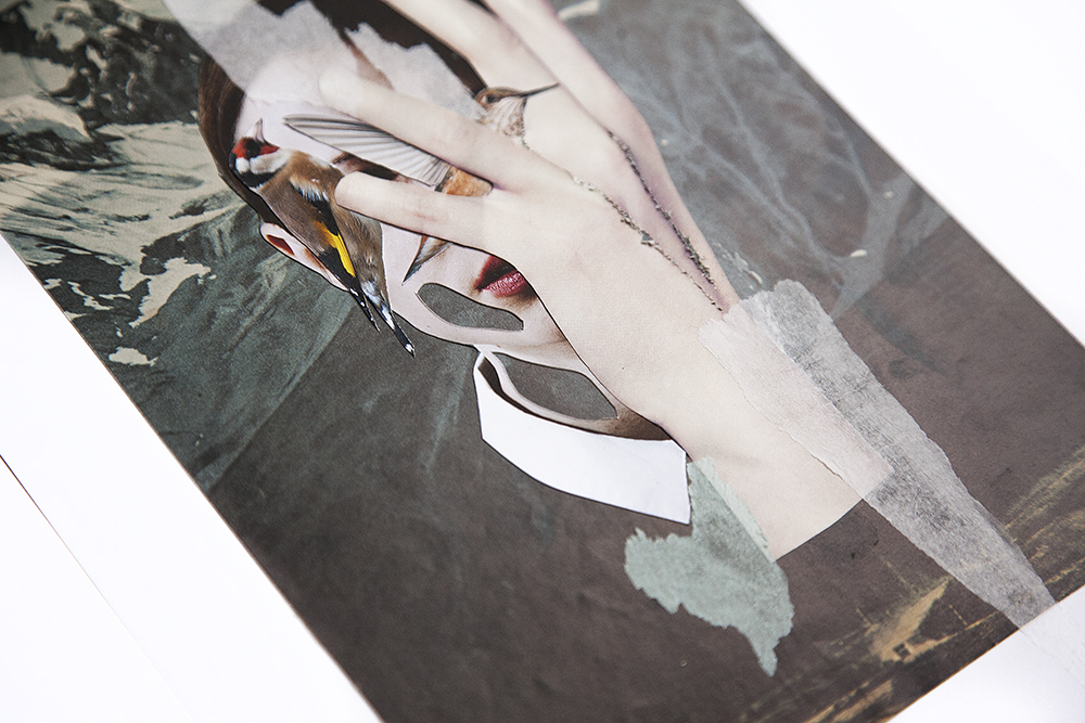 Es genial cuando encuentras a una persona que te resulta inspiradora, eso me ha ocurrido a mí con Clara del Val. Tras mi serie Hypnopompic, tenía muchos retratos preciosos con ella que sabía que en algún momento tendría que utilizar. En esta ocasión, ha sido para realizar una breve serie con algunos elementos de siempre y otros nuevos (las texturas con papeles transparentes de colores). No sé por qué, pero últimamente y con bastante frecuencia, tengo sueños en los que aparecen aves de diversa índole, que mutan y cambian de color y se cuelan entre las cavidades corporales de una figura imaginaria, que me observa callada, para después imitar los sonidos guturales de las visitantes que revolotean a nuestro alrededor.
