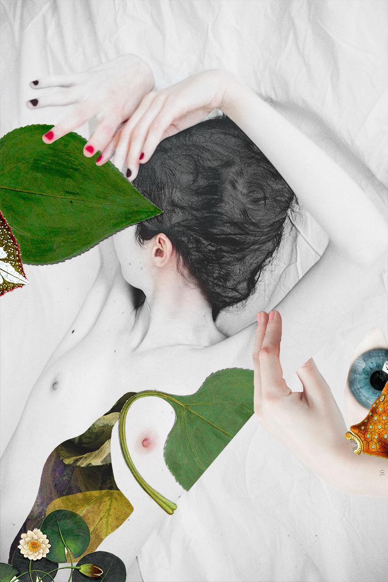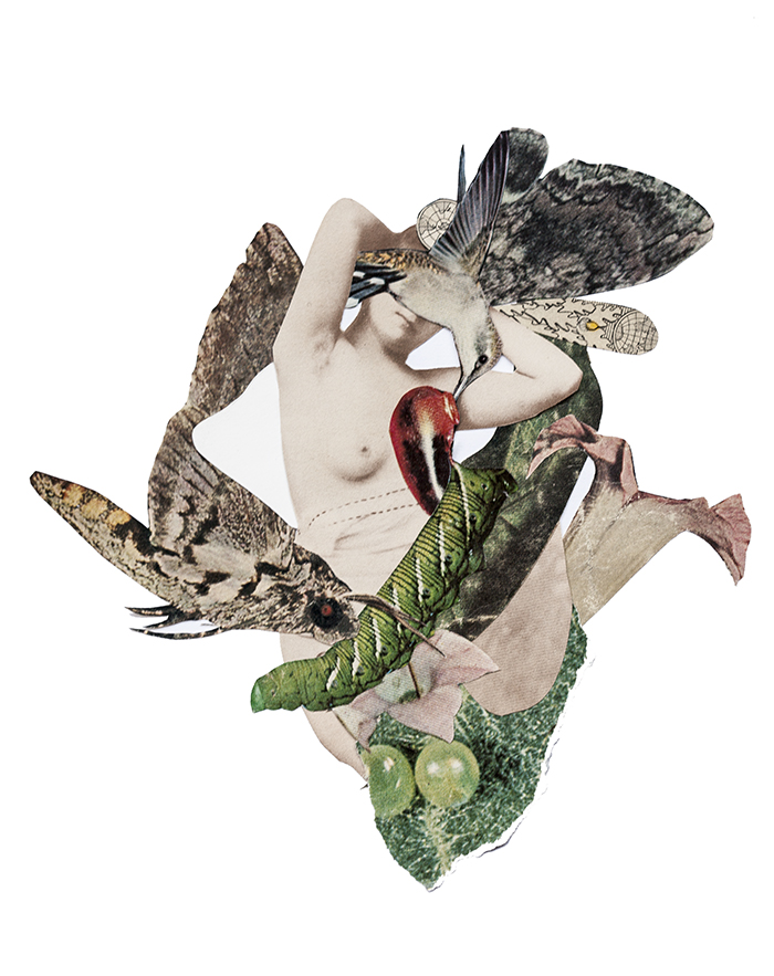 Comencé esta serie porque quería realizar un collage para mi hermana Amara por el día de su cumpleaños. Empecé a revolver entre mis viejas revistas y encontré algunas maravillas gráficas que me inspiraron muchísimo acerca de la idea de la metamorfosis. A continuación os muestro dos de mis primeras ninfas, “Rojo Silente” entre diversas aves e insectos y “Letargo”.